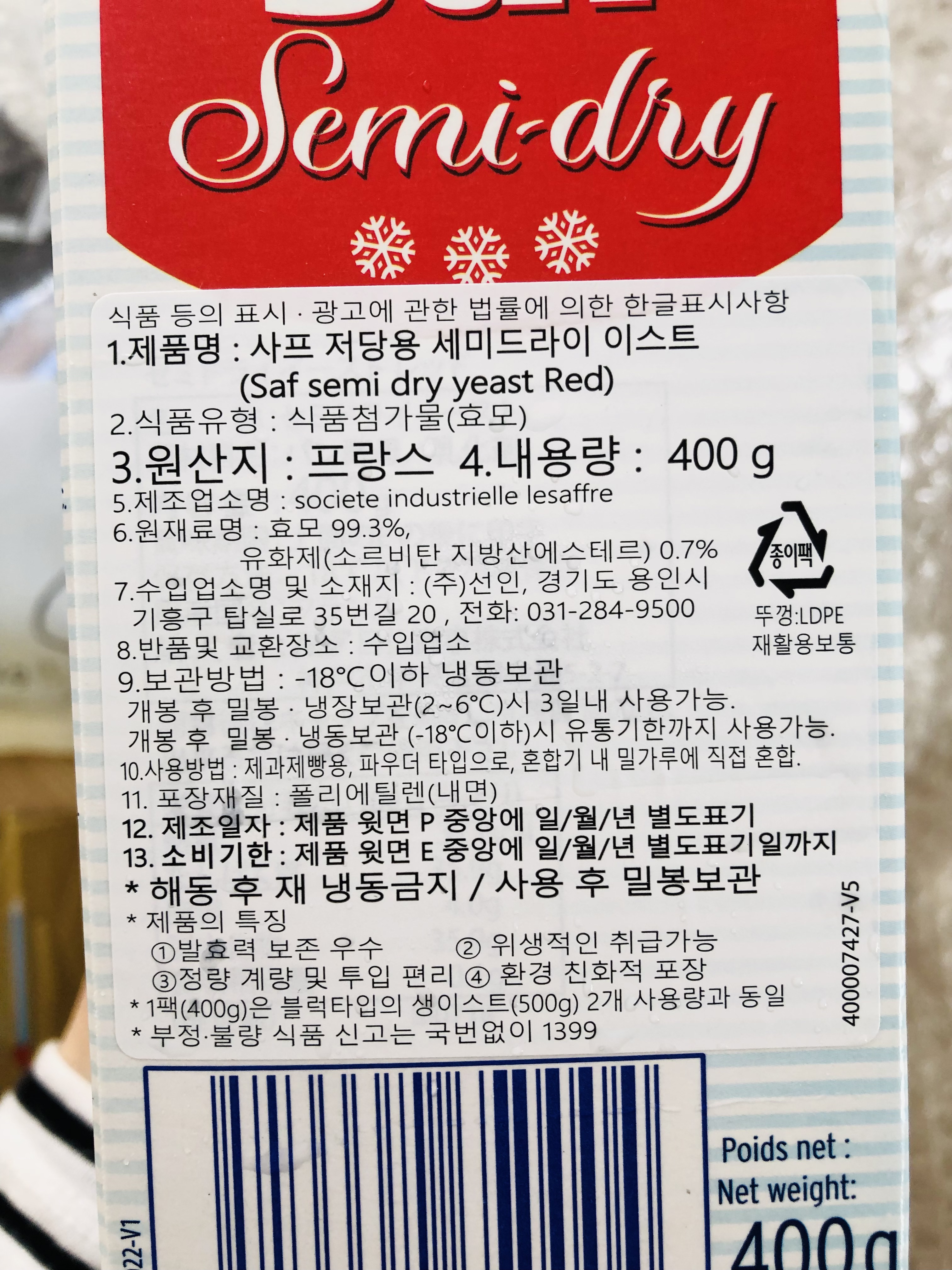사프 저당용 세미드라이 이스트 레드 400g 냉동 건조효모