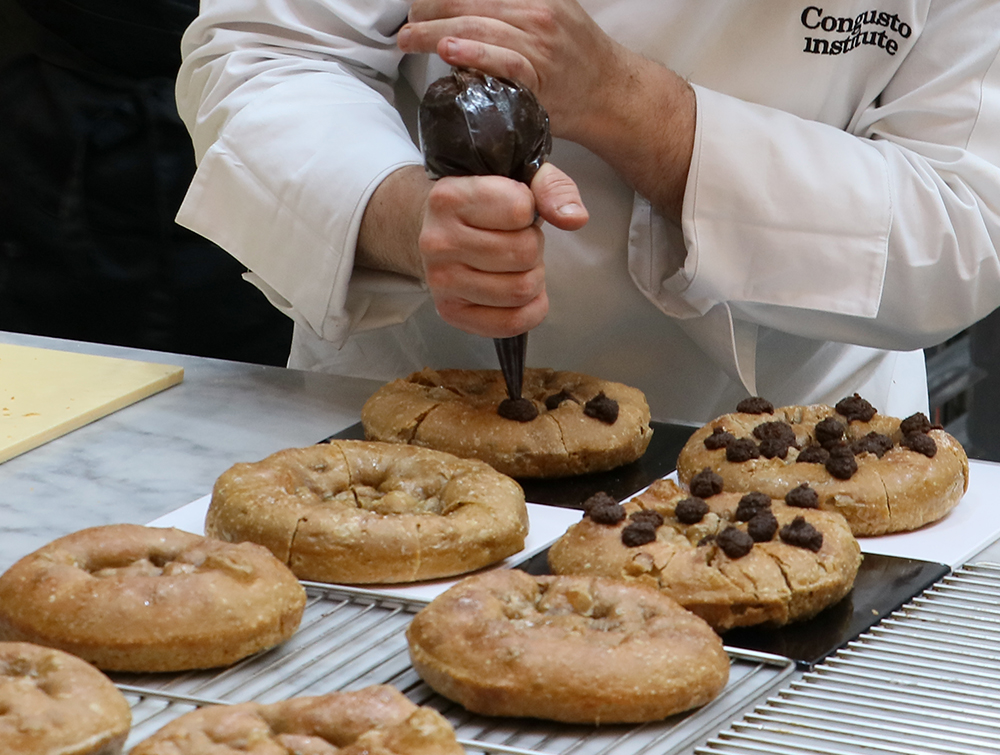 1. 피자가 식은 뒤에, 짤주머니를 사용해 커피쿠키 무스를 올려준다.